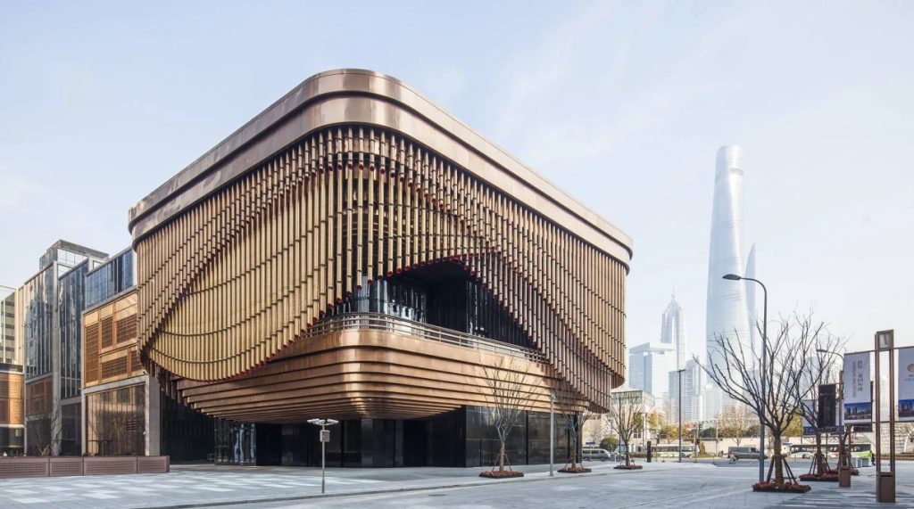 На пятом месте нашего списка – культурный центр фонда Фосун в Шанхае, Китай, возведённый в 2013 году по совместному проекту архитектурных бюро «Foster + Partners» и «Heatherwick Studio». Данная постройка является архитектурным центром масштабного многофункционального комплекса финансового центра Бунд общей площадью 420 000 м² и выделяется уникальным фасадом, состоящим из трёх слоёв 675 подвижных вертикальных бронзовых трубок высотой от 2 до 16 метров, конструкция которых вдохновлена традиционным китайским театром и бамбуковыми занавесами. Этот динамический фасад работает как «движущаяся завеса», в которой три ряда трубок непрерывно вращаются вокруг здания независимо друг от друга, изменяя его облик.
