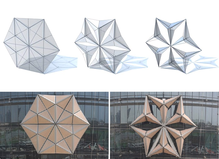 Модули представляют собой плоские треугольные панели, которые двигаются с помощью линейных приводов, интегрированных в каждую из треугольных панелей и подключённых к центральной системе управления зданием. В течение дня программное обеспечение получает данные от фотоэлектрических датчиков и поочередно активирует элементы фасада, имитируя движение лепестков цветка: при зените солнца панели максимально раскрываются для защиты остекления, а в пасмурные часы или вечером компактно складываются гармошкой.